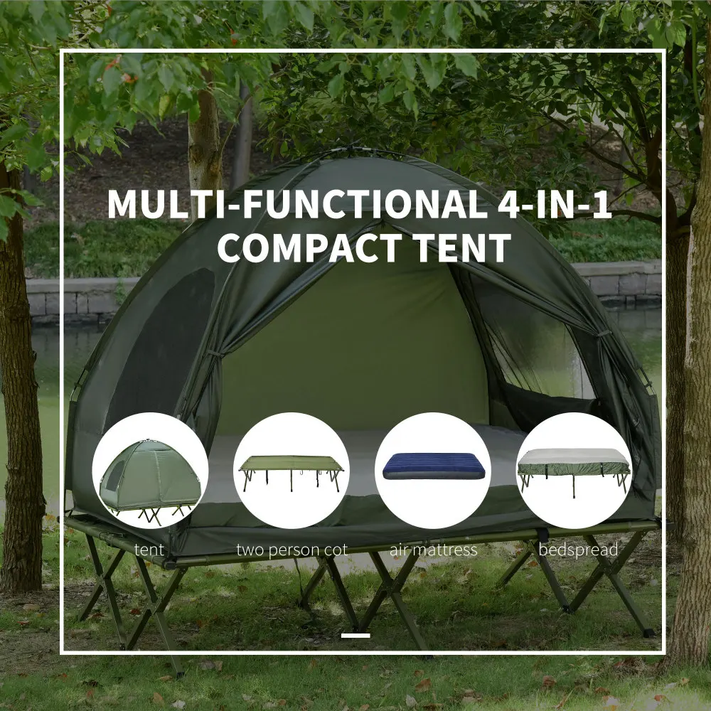 - Camping Combo: This multifunctional portable camping set includes an off the ground tent, 2 person cot, air mattress with pump, and bedspread. Both the tent and the camping bed are foldable, which greatly saves space when not in use. Multifunctional bag for easy carrying and storage.