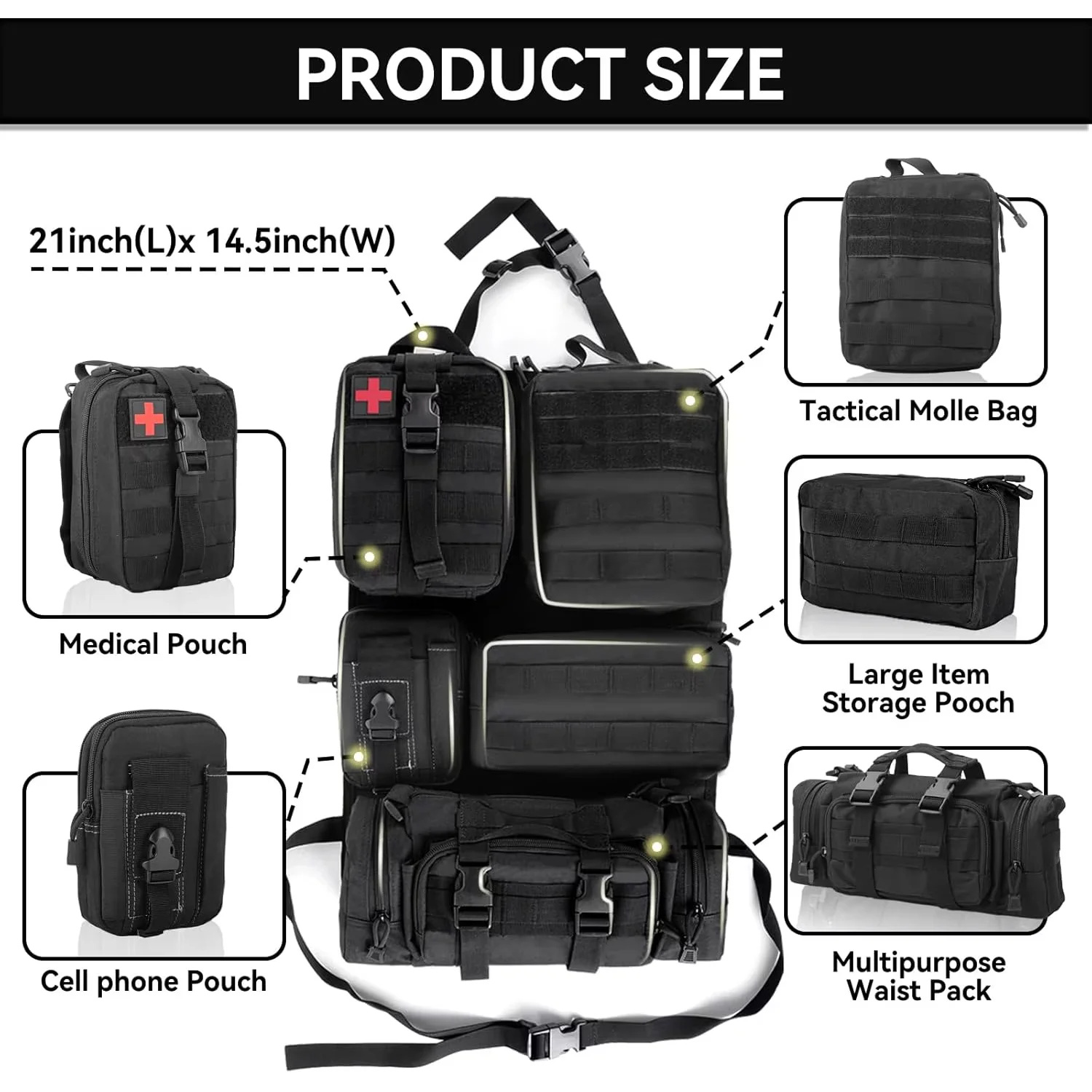 Detachable Bags: Comes with 5 detachable Molle bags, including 1 waist bag, 1 first aid kit and 3 tool bags. These bags can be custom configured to suit your needs, giving you quick access to the items you need for different situations and uses.