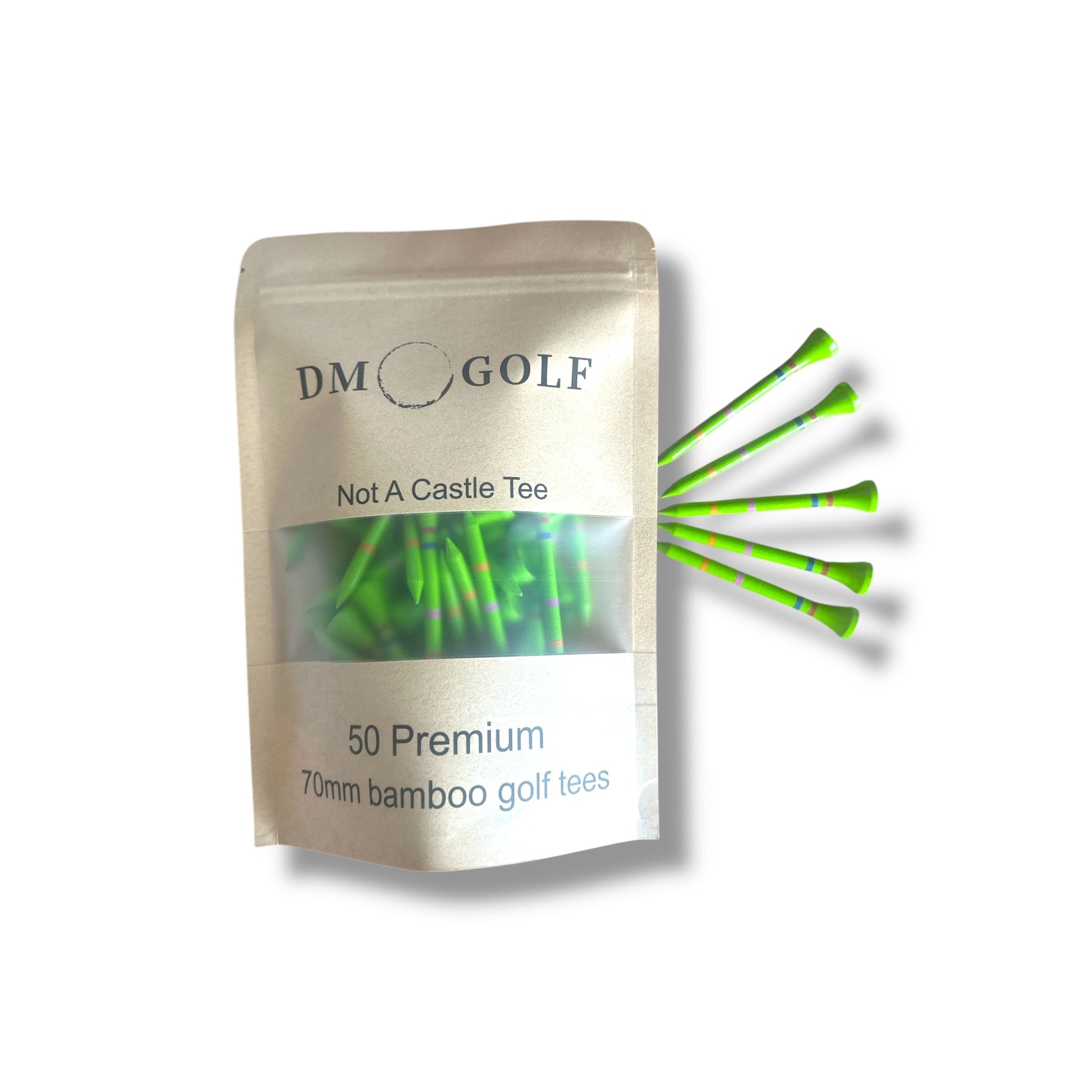 Go Green-Not A Castle Tee- Premium 70mm Bamboo Golf Tee With Orange, Pink, Blue & Red Castle Tee Height Indicators-50 Pack