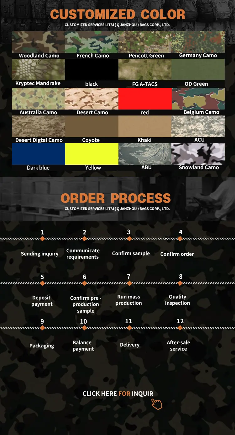 We are Litai (Quanzhou) Bags Corp., Limited company from China, a manufacturer of tactical gears including tactical backpack, vest, duffel bag,tool bag, holster and more. Over 15 Years' Experience